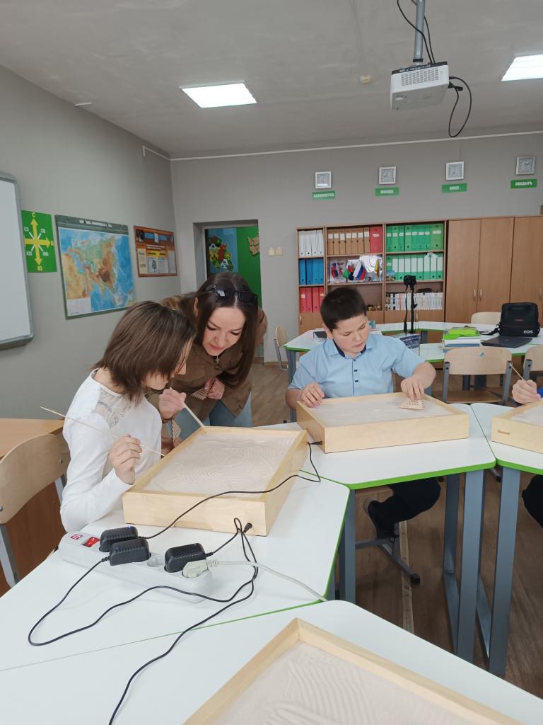 Проводятся с ребятами школы-интерната мастер - класс по рисованию песком на стекле. Данная технология позволяет развивать моторику, координацию. Дети фантазировали, сочиняли разные истории. Члены рабочей группы рассказали о ходе работы в проекте.